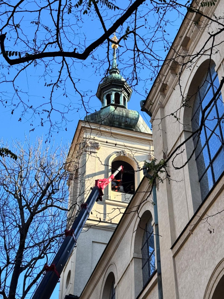 Instalace zvonu svobody v kostele Nejsvětějšího Salvátora minijeřábem UNIC-1006