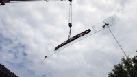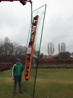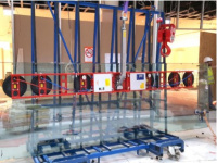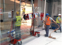 Vakuové zvedací zařízení pro použití na staveništi s funkcí ručního otáčení a naklápění pro zvedání a přepravu dlouhých a úzkých skleněných prvků.