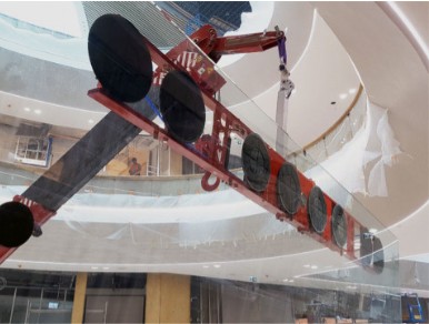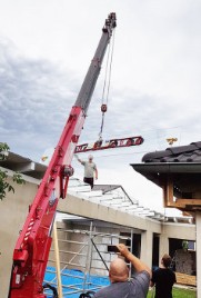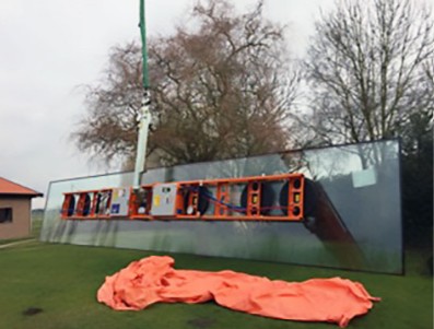 Vakuové zvedací zařízení pro použití na staveništi s funkcí ručního otáčení a naklápění pro zvedání a přepravu dlouhých a úzkých skleněných prvků.