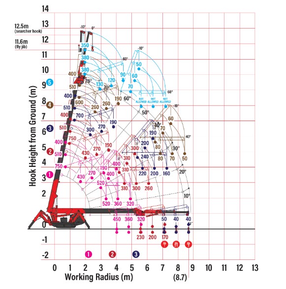 - Maximální pracovní rádius 8,41 m, 11,7 m s pátračem a háky na jednu šňůru