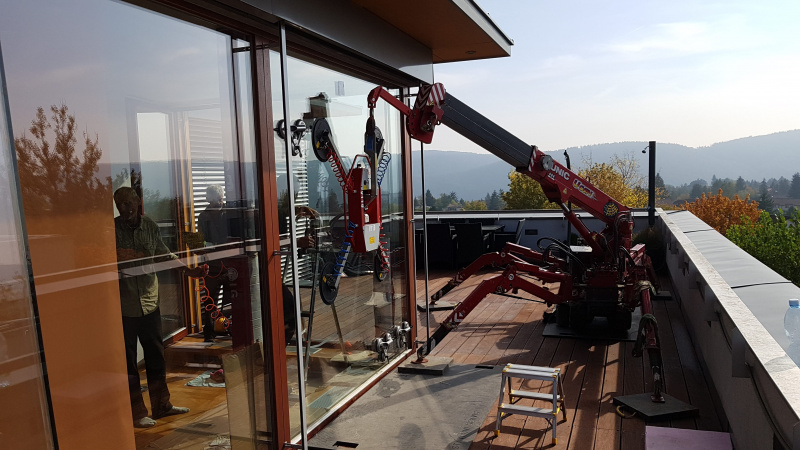 Pavoučí jeřáby UNIC provádějí montáže HS portálů (komfortních posuvných systémů), které jsou v poslední době jedním z nejžádanějších architektonických prvků. Naše pásové mini jeřáby v kombinaci s podtlakovým uchopovacím zařízením jsou ideální volbou pro jejich instalaci. Pavoučí mini jeřáb je díky svým malým rozměrům schopen pracovat na velmi malém prostoru, a zároveň disponuje velkou nosností.